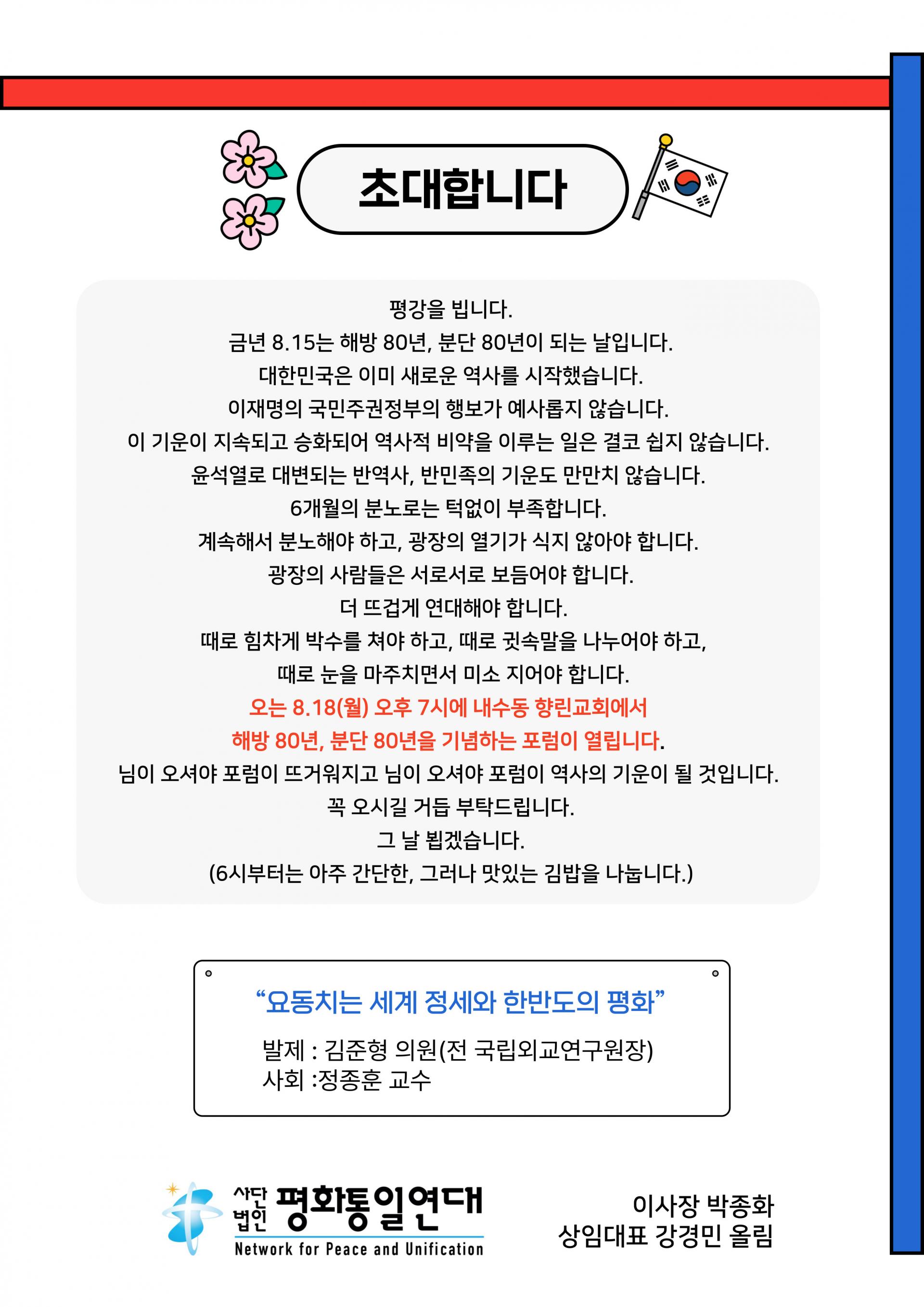 [평통연대] 김준형 국회의원(전 국립외교원장) 초청 포럼 (8/18, 향린교회)
